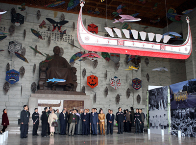 據(jù)臺灣中廣新聞報道,進(jìn)入主建筑物的二樓銅像大廳可以看到,蔣介石銅像仍維持原貌,但整個大廳裝飾了巨幅海報與歷史政治運動照片等,還垂掛風(fēng)箏以及“原住民“達(dá)悟魚舟紙做模型。