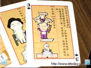 據(jù)臺(tái)灣東森新聞報(bào)道,在“立委”選舉前,國(guó)民黨文傳會(huì)制作了20萬(wàn)份“臺(tái)灣向前行”撲克牌,把陳水扁家族和臺(tái)當(dāng)局成員一個(gè)個(gè)列出。被放在“梅花K”的陳水扁,上面寫(xiě)著“偶臭了嗎?”,還用手挖著鼻孔,旁邊則列出陳水扁包庇貪污犯行“一妻、二秘、三師、四親家、五總管”。