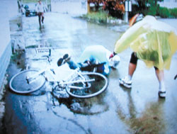 杜正勝離開水璉中途學校后前往預(yù)計中途休息點的新社小學,不料新社小學旁水泥道路有些坡度,加上連日陰雨地面濕滑、長青苔,同行隊友見杜正勝騎得有些吃力,好心推他一把,接著杜正勝因地面濕滑而摔跤。