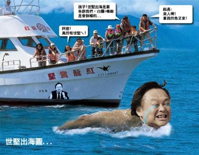 據(jù)臺灣東森新聞報道,王世堅夸下海口,只要“立委”選戰(zhàn)臺北市國民黨八仙過海,拿到所有席次他會跳海。如今為了這個承諾,媒體緊迫盯人,生怕一不小心漏掉這則跳海新聞,最新版本則傳出他將在臺北縣萬里碼鋉漁港跳海,雖然未獲證實,但相關(guān)單位都派駐大批人力,前往漁港附近待命以防意外發(fā)生。
