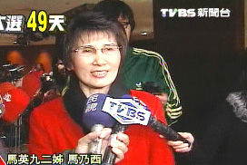 中新網(wǎng)2月2日電 據(jù)臺(tái)灣東森新聞報(bào)道,距離臺(tái)灣“大選”只剩下49天,馬英九的二姊馬乃西,已經(jīng)低調(diào)投入輔選的行列,老藝人尾牙(年終宴會(huì))和書法界馬蕭后援會(huì)的成立大會(huì)上,馬乃西都親自出席,但不同于大姊馬以南,馬乃西非常低調(diào),有關(guān)馬英九的問(wèn)題統(tǒng)統(tǒng)不回答。
