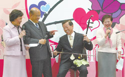 謝長廷還用二胡拉奏《月亮代表我的心》。他形容自己很“浪漫”,感激妻子游芳枝一路相挺,接著即興創(chuàng)作一首情詩:《我在這里愛你》:“當我說愛你的時候,風中的松樹吟詩般的葉子輕輕唱出你的名字:芳枝。”