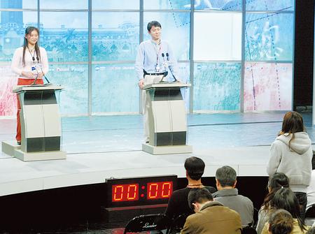 馬英九與謝長(zhǎng)廷首場(chǎng)電視辯論會(huì)將于今天登場(chǎng),主辦單位昨天排練民眾提問(wèn)時(shí),特地在左邊位置準(zhǔn)備小木板給謝長(zhǎng)廷,讓其與馬英九高度相當(dāng)。(圖:臺(tái)灣《中國(guó)時(shí)報(bào)》)