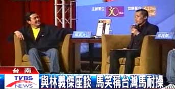 這邊造勢炮火很猛,另一頭則是溫馨的感性座談,馬英九和極限長跑好手林義杰面對面大講冷笑話。極限長跑好手林義杰:“在沙漠的時候,蒙古人騎的馬,他們的馬已經(jīng)跑不動了,就是因為路途太長,動物可能沒辦法接受。”馬英九:“臺灣的馬不會這樣。”