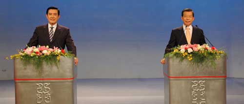 中新網(wǎng)3月8日電 臺灣地區(qū)領(lǐng)導(dǎo)人選舉第二場候選人電視政見發(fā)表會七日晚登場,國民黨候選人馬英九與民進黨候選人謝長廷再度自制政見廣告牌,透過兩輪交叉政見發(fā)表方式,就婦女政策、承認大陸學(xué)歷、開放陸資投資住宅、攻擊家人負面文宣、北高(臺北、高雄)市長政績等議題攻防。