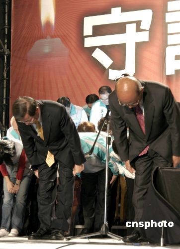 中新網(wǎng)3月22日電 據(jù)臺灣東森新聞報道,民進(jìn)黨輸?shù)?008年“大選”,謝蘇配大敗,得票與對手馬蕭相差超過220萬票,謝長廷7點(diǎn)半上臺,向支持者致歉和致謝。