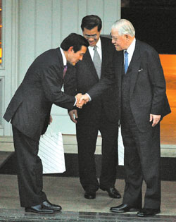 馬英九、蕭萬長27日下午4時(shí)半抵達(dá)李登輝寓所翠山莊。李登輝和夫人曾文惠在門口迎接馬蕭,四人臉上堆滿笑意。李登輝、馬英九主動(dòng)向守候媒體揮了揮手,隨后一起走進(jìn)屋內(nèi)。