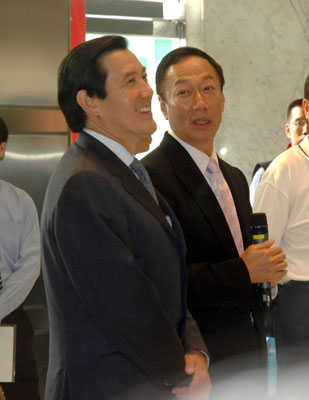據(jù)“中央社”報(bào)道,郭臺(tái)銘今天下午四時(shí),在位于臺(tái)北縣土城市的鴻海精密公司,親自迎接馬英九的到來(lái)。一進(jìn)入公司大廳,郭臺(tái)銘向馬英九介紹張貼在大廳梁柱的一幅對(duì)聯(lián)。