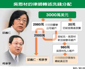 據(jù)臺灣《聯(lián)合報》報道,徐景星說,根據(jù)吳思材留下的洗錢分配流程數(shù)據(jù)及吳思材先前告訴他,臺涉外部門透過辦理“機密外交”常使用的一家人頭公司(慶寧公司)賬戶,先將兩千九百八十萬美元匯到金紀玖和吳思材在新加坡銀行開立的聯(lián)名賬戶內(nèi);其中九百八十萬美元,金紀玖對吳思材說:“老板(邱義仁)指示要把九百八十萬匯到你個人賬戶內(nèi)!庇谑菂呛徒鸺o玖辦理轉(zhuǎn)匯,當時張瓊森也在場。