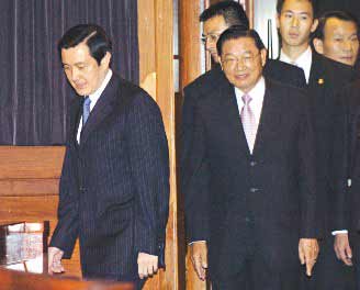 馬英九10晚在5.20后首次出席海基會臺商端節(jié)聯(lián)誼活動晚宴,與今天赴大陸展開兩會復(fù)談的;鶗麻L江丙坤一同進(jìn)入會場。 聯(lián)合報圖