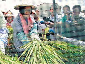 從未割過稻的蔡英文,跟著農(nóng)民左手抓起一把稻穗,接著右手以鐮刀割下,一開始動(dòng)作有些生疏,第二次即有模有樣,她興奮地將自己的收成高高舉起,成為鏡頭獵取對象。