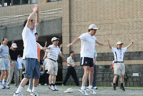馬英九(前右二)七月二十五日在陽明山上,與臺行政當(dāng)局高官們一起做早操。(“中央社”圖)