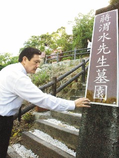 但因墓前傾頹敗破,磚石廢物垃圾雜亂堆置,要前往追思無(wú)路可循,因此蔣渭水之孫蔣朝根今年四月向馬英九反映,馬英九再轉(zhuǎn)告知臺(tái)北市府,重新規(guī)劃新步道。因此馬英九今天是修葺完成后特別前往追念,這也是臺(tái)灣地區(qū)領(lǐng)導(dǎo)人第一次到蔣的墓前瞻仰致敬。