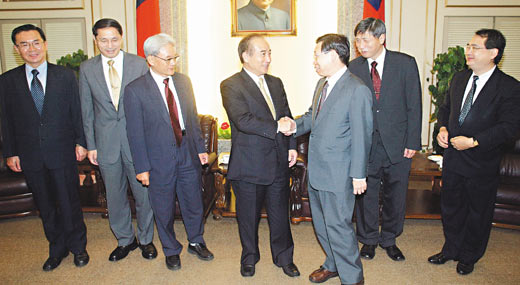 臺(tái)灣“司法院”新任“大法官”(左起)葉百修、陳春生、黃茂榮,陳新民(右一)、陳敏(右二),3日由“司法院秘書長(zhǎng)”謝文定(右三)帶隊(duì)拜會(huì)臺(tái)“立法院長(zhǎng)”王金平(右四)。(圖:臺(tái)灣《聯(lián)合報(bào)》)