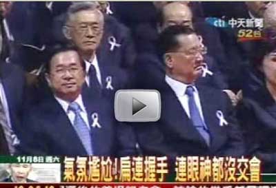 此時(shí),馬英九起身回禮,扁、馬短暫交流,隨后陳水扁和“副總統(tǒng)”蕭萬(wàn)長(zhǎng)夫人朱俶賢及“前副總統(tǒng)”連戰(zhàn)也握手致意,但馬英九之前見(jiàn)陳水扁上前還禮貌起身,相形之下,朱俶賢與連戰(zhàn)則是坐著握手,一旁的連方瑀連看都不想看陳水扁。