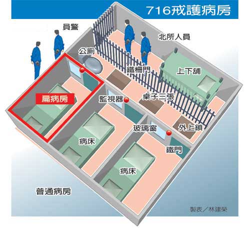 板橋醫(yī)院戒護(hù)病房是將七一六號(hào)病房另設(shè)門戶,在走廊盡頭設(shè)置一道電動(dòng)玻璃鋁門隔開(kāi),另以兩道鐵柵門將內(nèi)部隔出看守所人員休息區(qū)、戒護(hù)區(qū),其余空間再分隔成三間每間不到兩坪大的單人房,每間單人房的鐵板門自外上鎖,看守所人員可從墻面的一道玻璃窗察看,每間小病房天花板都有一座監(jiān)視器。