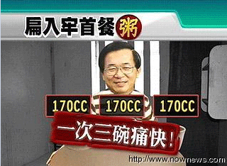 中新網(wǎng)11月28日電 據(jù)臺灣“今日新聞”報道,身陷洗錢疑云的陳水扁遭收押后即以禁食抗議,不過,昨天(27日)晚間已恢復(fù)進食,不但喝了500毫升的粥,還吃了一顆水煮蛋。國民黨“立委”邱毅諷陳水扁說,別一口氣吃太多,以免“瀉肚”。