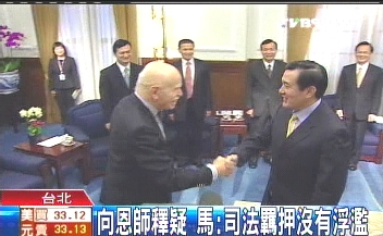 中新網(wǎng)12月16日電 馬英九在美求學(xué)時(shí)的老師孔杰榮質(zhì)疑臺(tái)相關(guān)部門對(duì)陳水扁案件司法羈押的正當(dāng)性;今天馬英九接見(jiàn)這位恩師時(shí)澄清,上手銬不是針對(duì)個(gè)人,臺(tái)灣司法羈押也沒(méi)有浮濫的情況。