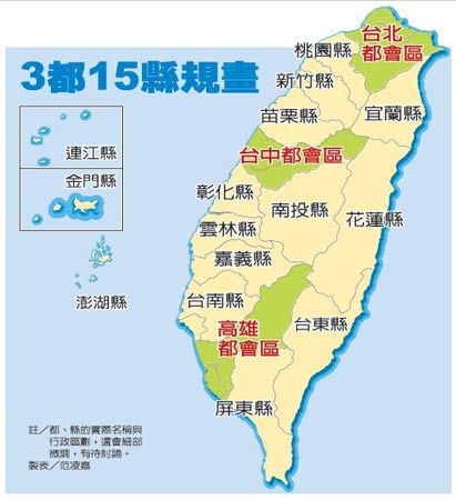 據(jù)稱,“三都十五縣”的三都是:臺北都會區(qū)(臺北市、縣、基隆市,民國一○三年合并)、臺中都會區(qū)(臺中市、縣,九十九年合并)、高雄都會區(qū)(高雄市、縣,南部縣市長爭取一百年合并)。十五縣是:桃園、新竹(新竹市、縣)、苗栗、彰化、南投、云林、嘉義(嘉義市、縣)、臺南(臺南市、縣)、屏東、宜蘭、花蓮、臺東、澎湖、金門、連江。