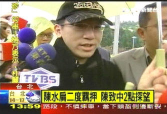 中新網(wǎng)12月30日電 據(jù)臺灣TVBS報(bào)道,陳水扁第二度遭到羈押,由于沒有禁見,他的兒子陳致中在今天下午兩點(diǎn)到臺北看守所探視。