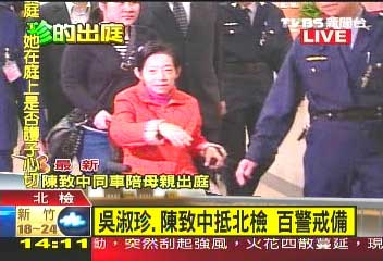 吳淑珍在兒子陳致中的陪同下,于下午2點(diǎn)10分左右,到達(dá)臺(tái)北地方法院開庭,因臺(tái)北地檢署才有無障礙設(shè)施,吳淑珍由北檢進(jìn)入,再搭電梯到北院。