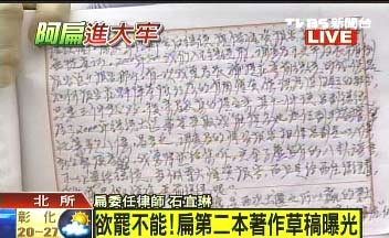 中新網(wǎng)2月18日電 據(jù)臺(tái)灣TVBS報(bào)道,出了第一本新書(shū)《臺(tái)灣十字架》后,有了暢銷(xiāo)作家的頭銜,陳水扁欲罷不能,在看守所里持續(xù)寫(xiě)書(shū),今天第二本書(shū)的著作手稿曝光。