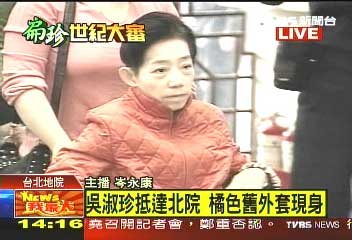 下午2點15分,吳淑珍穿著橘色舊外套,在兒子陳致中及陳水扁高中同學(xué)吳文清陪伴下,抵達臺北地方法院,進入法院后還用手遮住,打了一個呵欠;雖然場外還是有挺扁和反扁民眾聚集叫囂,但人數(shù)明顯比前幾次減少了。