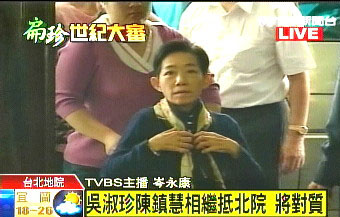 中新網(wǎng)3月17日電 據(jù)臺灣TVBS報道,17日下午2點24分,陳水扁夫人吳淑珍穿著藍色針織毛衣,披著絲巾,在兒子陳致中的陪同下,進入法院。陳鎮(zhèn)慧則是戴著大墨鏡,白外套、黑上衣,低調(diào)進入法院。今天首次進入實質(zhì)審理,雙方對質(zhì),備受注目!