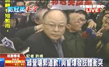 出關(guān)后,臉部表情略顯蒼白、鐵青的郭冠英,面對(duì)現(xiàn)場(chǎng)兩派人馬包圍、抗議的聲浪,并未再度發(fā)表談話,并在黑衣人簇?fù)硐拢钌献囯x開機(jī)場(chǎng)。
