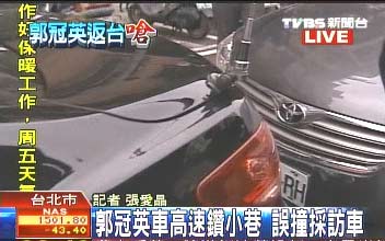 之后,郭冠英座車抵達(dá)臺(tái)北市區(qū),在媒體車輛的跟拍下,發(fā)現(xiàn)郭冠英的座車在臺(tái)北市大小街頭繞來繞去,并未前往“新聞局”也未返家,似乎想要把記者跟車甩掉。郭冠英座車甚至一度和緊跟的媒體采訪車在臺(tái)北醫(yī)學(xué)院附近發(fā)生輕微擦撞,由于人車并無大礙,郭冠英車輛隨即再度駛離,并繼續(xù)在臺(tái)北街頭亂逛。