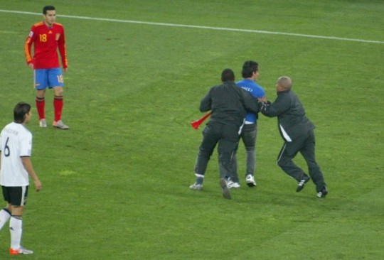 中新網(wǎng)7月8日電 世界杯安保問題在遇挑戰(zhàn),在北京時(shí)間8日凌晨進(jìn)行的德國(guó)和西班牙的半決賽中,一名球迷竟然沖入球場(chǎng),導(dǎo)致比賽被迫中斷。