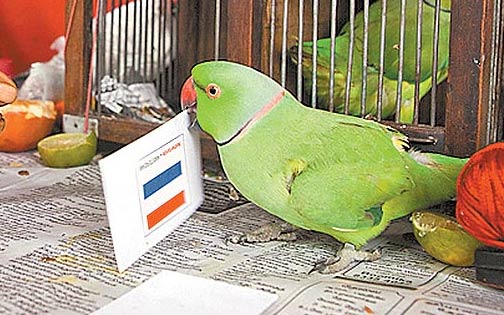印度出生、住在新加坡的穆尼亞龐,近5年來都在餐廳前設(shè)攤,幫當(dāng)?shù)厝瞬聵吠柑柎a或安排結(jié)婚良辰吉日,這位老人說:“它是一只很特別的鳥!”和參與過2008年歐洲國家杯預(yù)測戰(zhàn)局的保羅相比,13歲曼尼算是“菜鳥”了,因?yàn)榻衲晔澜绫闱蛸愂锹岬?次預(yù)測運(yùn)動賽果。
