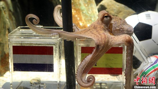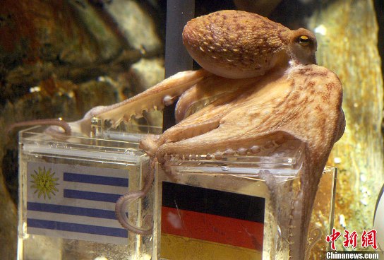 章魚(yú)“保羅”絕對(duì)是本屆世界杯賽的大明星,對(duì)德國(guó)隊(duì)的比賽的競(jìng)猜他已經(jīng)是屢試不爽。除了兩年前尚處在幼年的它對(duì)歐洲杯預(yù)測(cè)6中其5,猜錯(cuò)了決賽外,其他的比賽,包括本屆世界杯賽,它猜中了13場(chǎng)比賽中的12場(chǎng)!