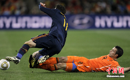 中新網(wǎng)7月12日電 今天凌晨2:30,南非世界杯迎來(lái)了最終的決賽,由荷蘭隊(duì)在約翰內(nèi)斯堡的足球城球場(chǎng)對(duì)陣西班牙。最終雙方經(jīng)過(guò)120分鐘鏖戰(zhàn),由伊涅斯塔在第116分鐘攻入唯一一粒進(jìn)球,絕殺十人應(yīng)戰(zhàn)的荷蘭隊(duì),史上首次奪得冠軍。