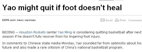 中新網(wǎng)7月28日電 據(jù)EPSN報(bào)道,姚明近日在北京參加慈善晚宴時(shí),在接受網(wǎng)友提問(wèn)中親口證實(shí)將在今年季前賽復(fù)出,但他同時(shí)講出驚人之語(yǔ):一旦出現(xiàn)腳傷反復(fù)的最壞情況,不排除下個(gè)賽季就退役。