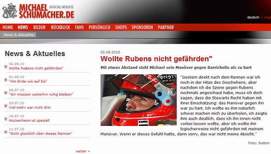舒馬赫在官網(wǎng)上稱:“再次看過我與魯本斯之間的錄像后,我覺得干事的處罰是正確的。那種強(qiáng)硬的防守確實(shí)太過分了。我沒有發(fā)覺我的動(dòng)作帶給他的危險(xiǎn)。如果他這么覺得,那么我要說:對不起,我不是故意的。”