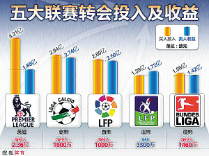 由于對于轉(zhuǎn)會費看法不一,各國媒體對于總體轉(zhuǎn)會費的統(tǒng)計存在差距,但目前比較可信的數(shù)據(jù)顯示,今夏轉(zhuǎn)會市場上,英超以4.21億歐元的投入雄踞榜首。《每日電訊報》援引了這個數(shù)據(jù),但資料同時顯示,英超轉(zhuǎn)會收入只有1.85億歐元。也就是說,英超凈投入達到2.36億歐元。但真正令人震驚的數(shù)據(jù)還在后面,英超大約2.6億英鎊的轉(zhuǎn)會費流到了歐洲大陸俱樂部的賬戶之中,本國聯(lián)賽之間的人才轉(zhuǎn)會費用不足一半,這個數(shù)字比去年同期增長了66%。