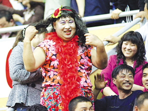 昨天的南京奧體看臺(tái)上,還來(lái)了一位貌似乳神的人,這究竟是什么回事呢?昨天比賽還沒(méi)開(kāi)始,奧體中心體育場(chǎng)的50區(qū)看臺(tái)就熱鬧無(wú)比。很多球迷紛紛圍到一名打扮性感的人邊上,爭(zhēng)相與“她”合影。而本報(bào)記者也從內(nèi)場(chǎng)走到看臺(tái)附近一探究竟。原來(lái),這是一位老舜天球迷,聞之巴拉圭正版乳神因故未能前來(lái)南京,為了彌補(bǔ)大家的遺憾,也是順便活躍一下現(xiàn)場(chǎng)氣氛,照著巴拉圭乳神里克爾梅的外形好好地裝扮了一下自己。由于這位男球迷是反串表演,所以他還特意用材料加以修飾,讓自己胸部的豐滿(mǎn)程度更加接近于乳神。于是,他便成為了昨天現(xiàn)場(chǎng)最為“耀眼”的明星,受歡迎程度甚至超過(guò)了巴拉圭球星圣克魯斯。除了這位比較搞怪的球迷,昨天來(lái)自全國(guó)各地的著名球迷也聚集奧體中心,“羅西”、“胖哥”等等耳熟能詳?shù)拿譃槟暇⿰W體中心的這場(chǎng)中巴之戰(zhàn)增色不少。