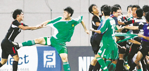 到了下半場(chǎng),雙方的動(dòng)作越來越粗野。第88分鐘,場(chǎng)上比分為1比1時(shí),北京國安隊(duì)的5名球員突然包圍幼獅隊(duì)的一名球員。接著,兩隊(duì)的替補(bǔ)球員紛紛沖進(jìn)球場(chǎng),彼此拳打腳踢打成一團(tuán)。