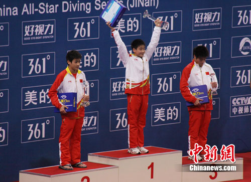 中新社濟南9月18日電 (張譯文)2010—2011中國跳水明星系列賽第二站的比賽18日晚繼續(xù)在濟南舉行。在剛剛結束的男子10米跳臺決賽中,北京選手曹緣憑借完美發(fā)揮獲得105.45高分奪得冠軍,亞軍、季軍分別被來自廣東的張雁全和上海的火亮獲得。
