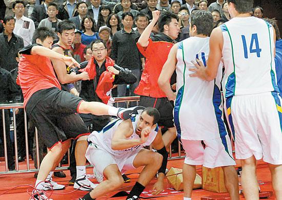 10月12日,中國(guó)球員(紅衣)與巴西球員大打出手。新華社記者 王頌攝
