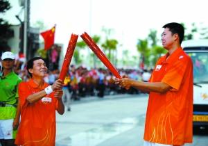 男籃老隊(duì)長(zhǎng)王治郅(右)在交接火炬。昨日,廣州亞運(yùn)會(huì)火炬?zhèn)鬟f活動(dòng)在惠州舉行。 新華社記者 劉大偉 攝