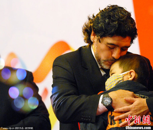依然是一襲筆挺的黑色西裝,依然是飛揚的神采,這是馬拉多納在北京公開亮相給人帶來的最直觀印象。然而這個無論在綠茵場上還是生活中都以“硬骨頭”形象示人的傳奇球星,卻在今天的一場慈善活動中,將自己感性的一面流露得淋漓盡致。