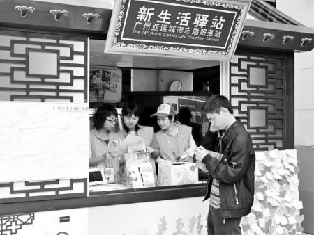 昨天下午當班的黃洪丹,是廣東交通職業(yè)學(xué)院的大二學(xué)生,也是同行8人的班長。她為記者一一介紹了站內(nèi)各種方便設(shè)施,告訴記者今天短短幾個小時,她們已經(jīng)接待了100多位前來咨詢的朋友,“就是剛才,我們剛給一大幫外國朋友指了去亞運村的路呢。”