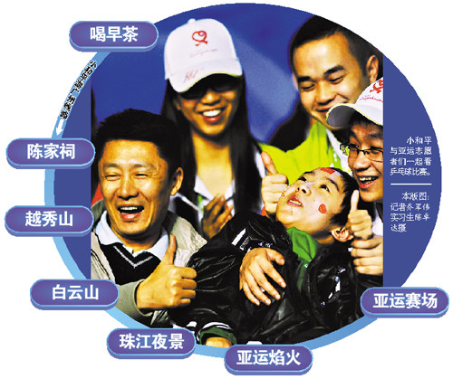 喝早茶、逛陳家祠、在五羊雕塑下照全家福……就在亞運開幕當天,由本報發(fā)起的“圓夢愛心團”帶著來自四川的絕癥少年小和平游廣州、嘗美食。昨天早上,在愛心團的陪護下,小和平又來到離醫(yī)院最近的廣州體育館,觀看中國隊與伊朗隊的乒乓球男雙比賽,這是他第一次現(xiàn)場看球賽。