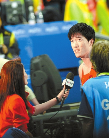 在賽道上僅僅逗留了13秒48,但在賽道一側(cè)的混合區(qū)里,近百名記者已經(jīng)等候了數(shù)十分鐘。終于,翹首企盼的飛人出現(xiàn)在通道的頂頭,狹窄的混合區(qū)里開始騷動,志愿者不得不手扶擋板,免于崩塌。