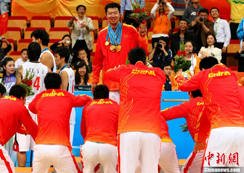 從NBA回到中國,王治郅找到了適合自己的位置。在姚明、易建聯(lián)缺席之際,這位第四次、也是最后一次出征亞運(yùn)大賽的老將就是一根定海神針。他不一定是每場比賽得分最多的,但他總會(huì)在關(guān)鍵時(shí)刻力挽狂瀾。中國男籃成功衛(wèi)冕后,所有隊(duì)員將金牌掛在他的脖子上并“頂禮膜拜”——這位傷病纏身的33歲老將,擔(dān)當(dāng)?shù)闷疬@份榮譽(yù)。