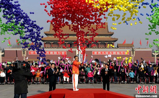 中新網(wǎng)北京12月4日電 2010年廣州亞洲殘疾人運(yùn)動(dòng)會(huì)火炬點(diǎn)燃暨火炬?zhèn)鬟f活動(dòng)啟動(dòng)儀式,今日上午在北京人民大會(huì)堂北大廳舉行。中共中央政治局常委、國(guó)家副主席習(xí)近平在啟動(dòng)儀式上點(diǎn)燃主火炬,并宣布火炬?zhèn)鬟f活動(dòng)開始。
