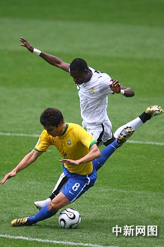 比賽開(kāi)始后巴西隊(duì)并沒(méi)有急于大舉壓上進(jìn)攻,第14分鐘加納獲得任意球機(jī)會(huì),阿多的頭球被塞薩爾神勇?lián)涑,力保巴西城門(mén)不失。第16分鐘巴西獲得角球,卡卡前點(diǎn)擺渡,效力俄羅斯莫斯科中央陸軍的前鋒瓦格納墊射破門(mén),幫助巴西1-0領(lǐng)先。隨后比賽雙方互有攻守,但都沒(méi)有進(jìn)球,上半場(chǎng)比賽結(jié)束,巴西1-0領(lǐng)先加納。
