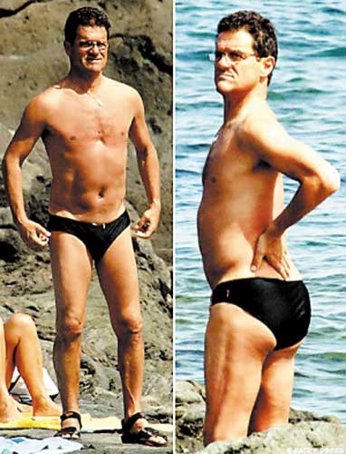 英國(guó)媒體近日曝光了卡佩羅攜妻子勞拉去西西里島度假的照片,英格蘭新帥卡佩羅僅著一條黑色游泳褲,另外眼鏡和沙灘鞋是僅有的隨身物品。照片清晰地顯示出了卡佩羅雖年過(guò)花甲,卻仍然擁有令人艷羨的健壯身材。